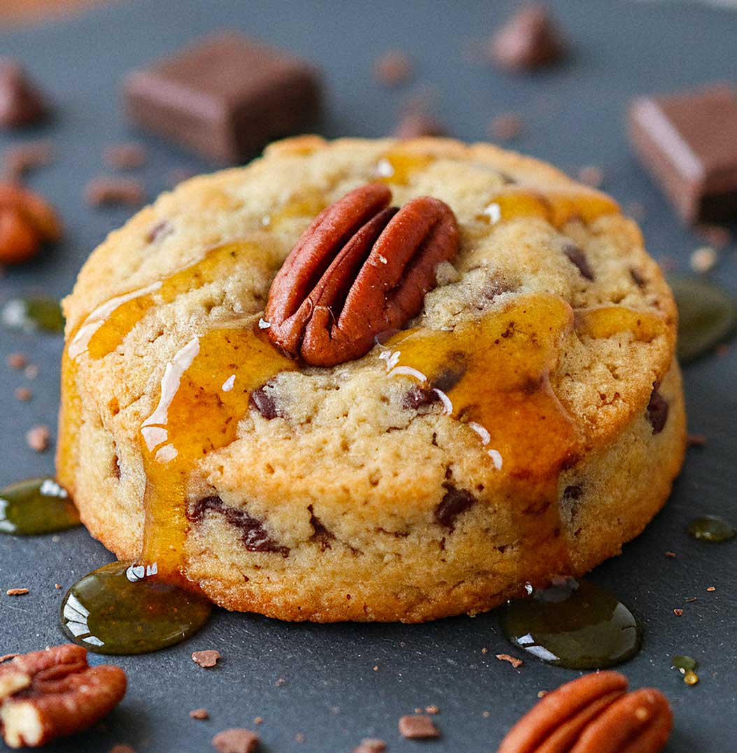 Base fondante sirop d’érable, des pépites de chocolat au lait et du croquant par les noix de pécan.