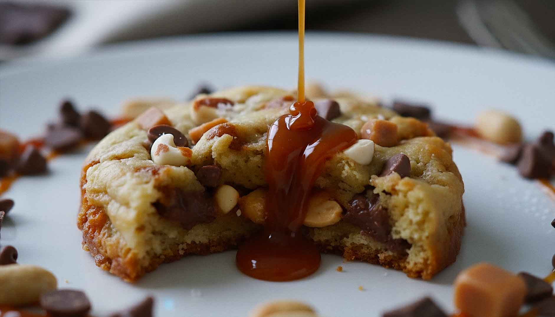 Une base croustillante, des pépites de chocolat au lait accompagnées de pépites de caramel au beurre salé, des éclats de cacahuètes et un cœur fondant au beurre de cacahuètes.